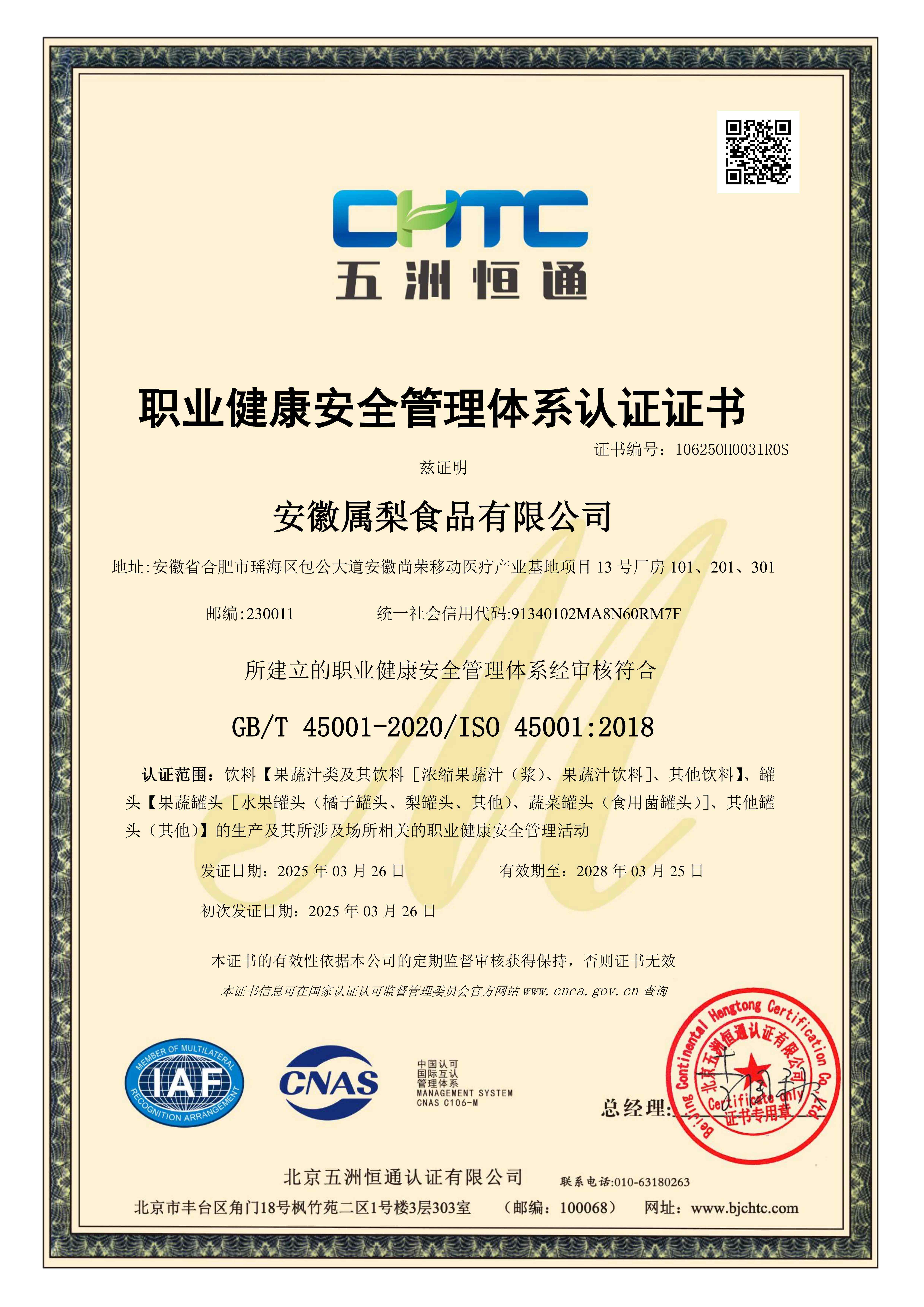 职业健康安全管理体系认证证书